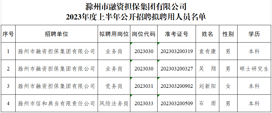 市擔(dān)保集團(tuán)2023年度上半年公開招聘擬聘用人員公示