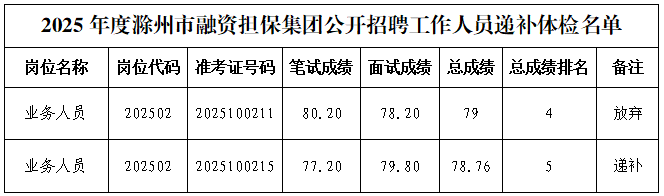 關于滁州市融資擔保集團有限公司2025年公開招聘工作人員遞補體檢的公告