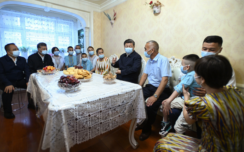 7月12日至15日,中共中央總書記、國(guó)家主席、中央軍委主席習(xí)近平在新疆考察。這是13日上午,習(xí)近平在烏魯木齊市天山區(qū)固原巷社區(qū),同維吾爾族居民阿布來(lái)提·吐爾遜一家人圍坐在一起拉家常。新華社記者 謝環(huán)馳 攝