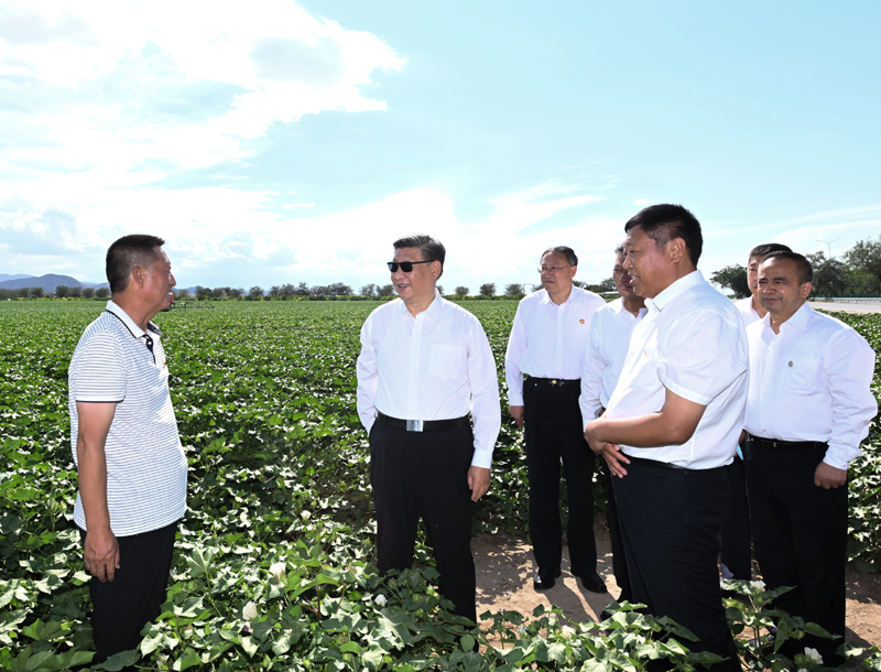 7月12日至15日,中共中央總書記、國(guó)家主席、中央軍委主席習(xí)近平在新疆考察。這是13日下午,習(xí)近平在新疆生產(chǎn)建設(shè)兵團(tuán)八師一四三團(tuán)農(nóng)一連棉花種植基地考察。新華社記者 謝環(huán)馳 攝